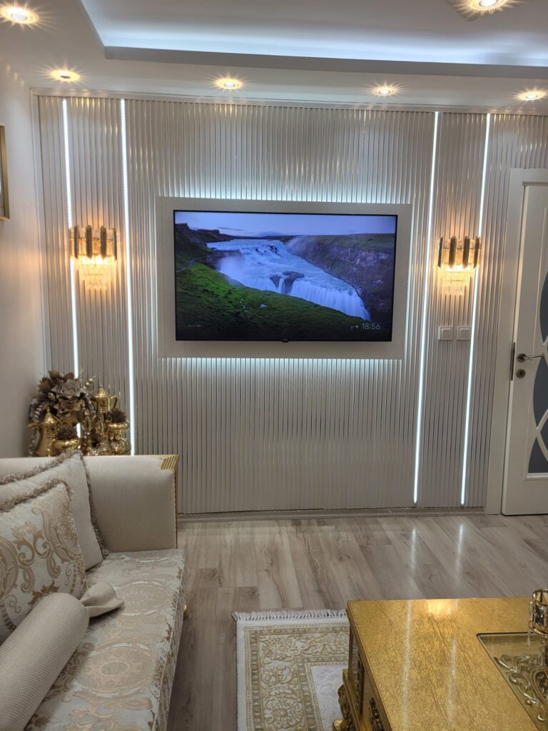 SBL Dekorasyon olarak bir dairede yer alan yaşam ünitesi duvarına lambri panel uygulamamızı tamamladık. Bu projede hedefimiz, televizyon ünitesinin bulunduğu alanı sıradan bir duvardan çıkarıp, mekânın odak noktası haline getirmekti.