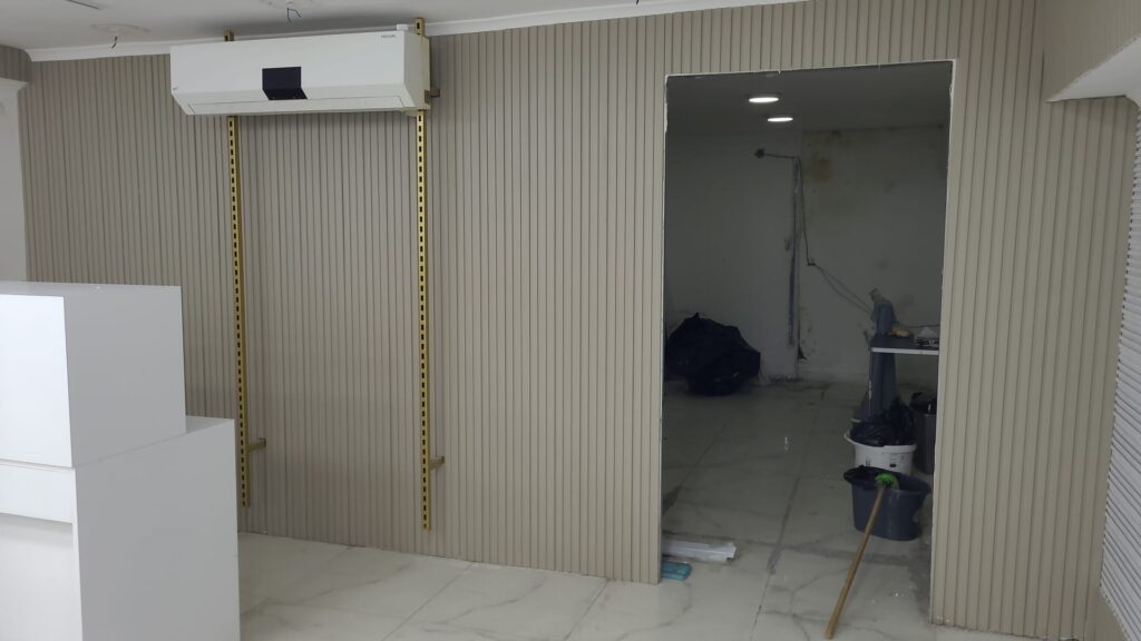 Seçilen lambri paneller, mağaza konseptiyle uyum sağlayacak şekilde duvar yüzeyine özenle monte edildi. Panel yerleşimi yapılırken mekânın bütünlüğü, simetri ve görsel denge özellikle dikkate alındı.
